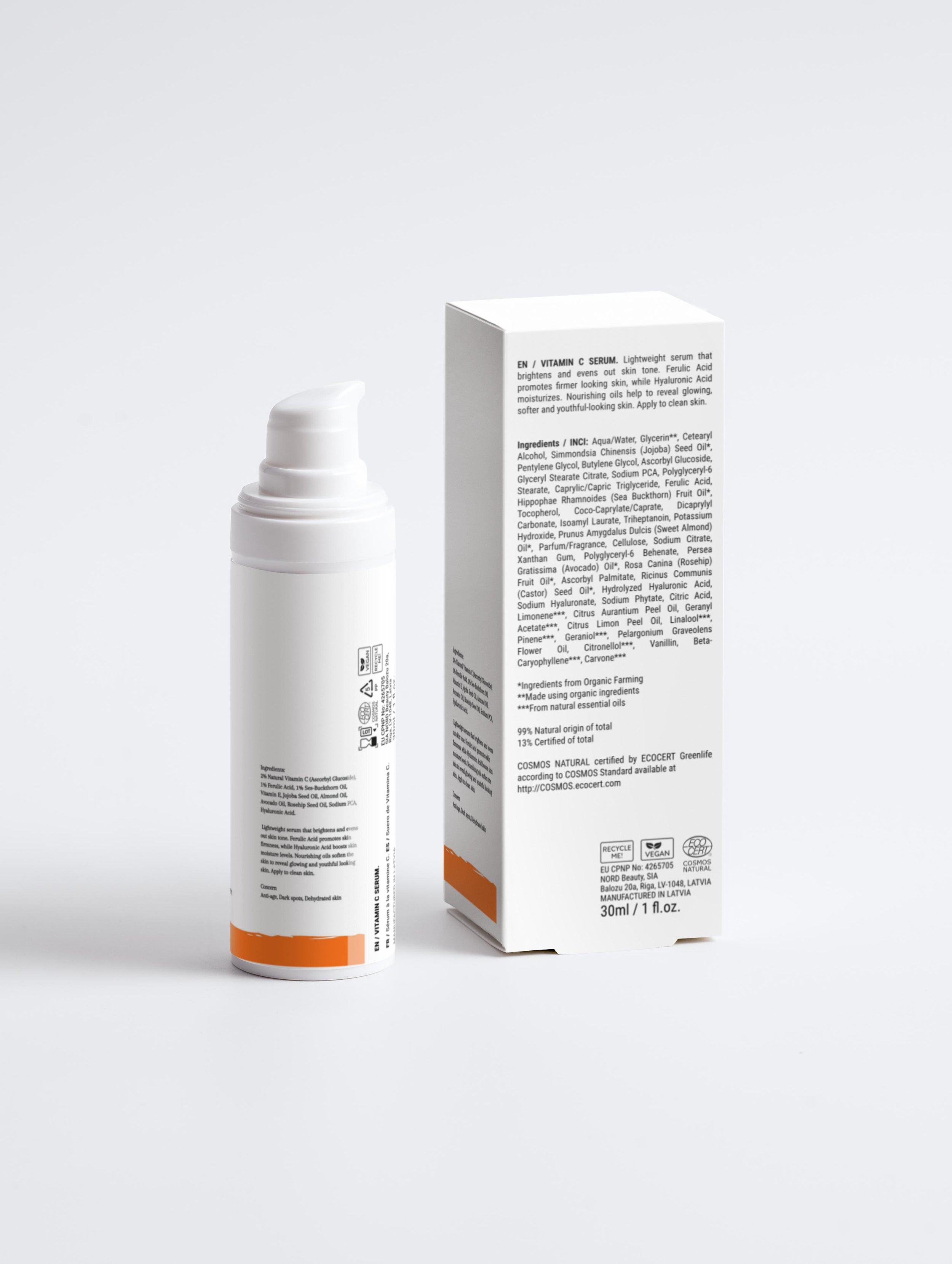 2% Natural Vitamin C (Ascorbyl Glucoside), 1% Ferulic Acid, 1% Sea-Buckthorn Oil, Vitamin E, Hyaluronic Acid, Sodium PCA, Jojoba Seed Oil, Almond Oil, Avocado Oil, Rosehip Seed Oil