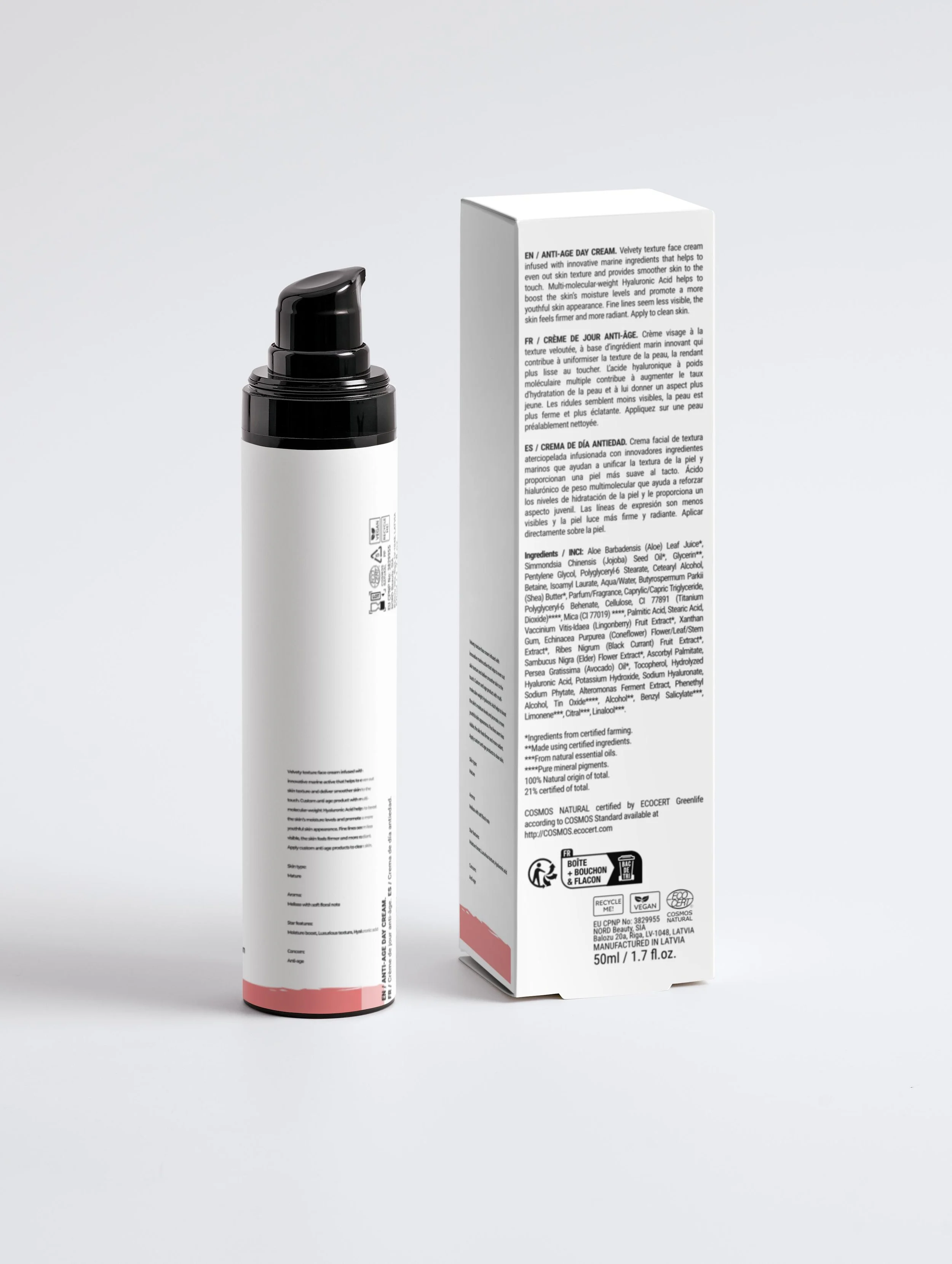 The Anti-Aging Day Cream is a high-performance moisturizer designed to smooth, hydrate, and visibly refine the skin throughout the day. Infused with an advanced marine active (Alteromonas Ferment Extract), it helps improve skin texture while promoting a softer, more even complexion.